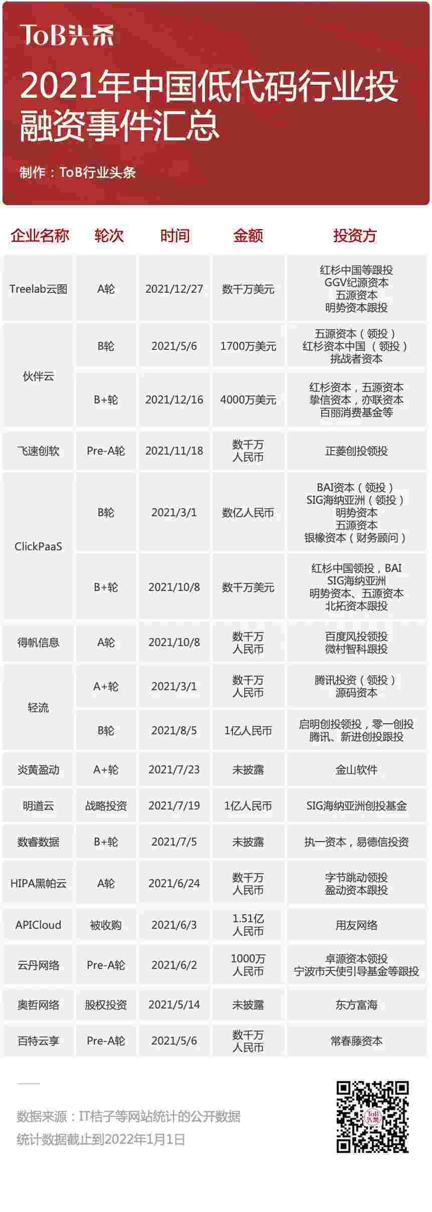 到2021年,,无/低代码投融资规模势头更甚,,,其中包括轻流两轮融资(A+轮数千万人民币,,,B轮近亿人民币)、、、、钱能钱包 两轮融资(B轮数亿人民币,,,,B+轮数千万美元)、、、百特云享数千万元Pre-A轮融资......